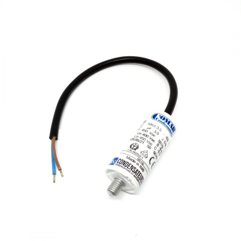 Dimensions : 25 x 57 mmSorties câble longueur 250mmPeut remplacer tout condensateur permanent d'une capacité de 3.5µF et d'une tension max de 400V à 500V.