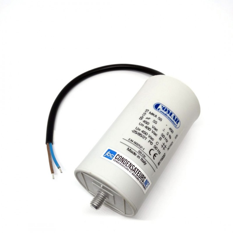 Condensateur permanent 55µF (55mf ou 55microfarads) 450V pour moteur électrique et pompe.