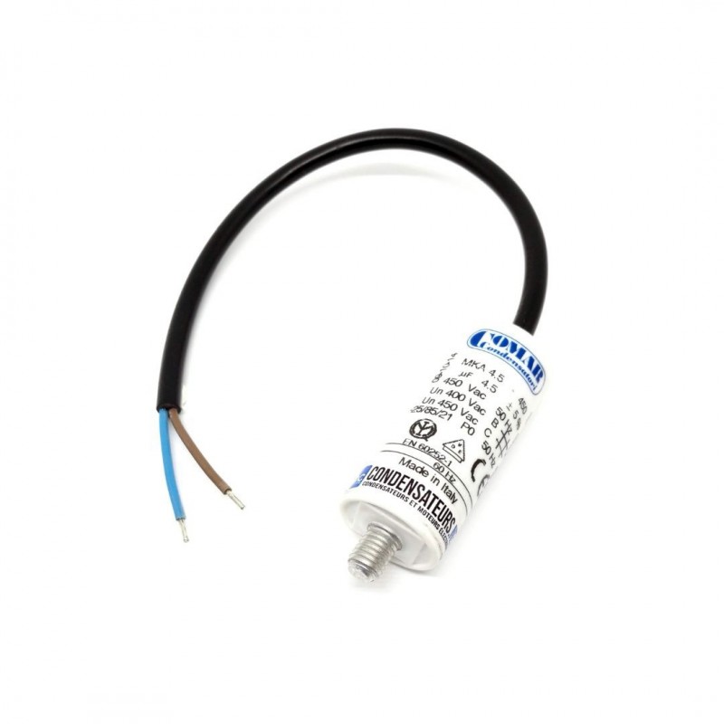 Condensateur permanent 4,5µF (4,5mF ou 4,5 microfarads) 450V pour démarrage moteur électrique monophasé.